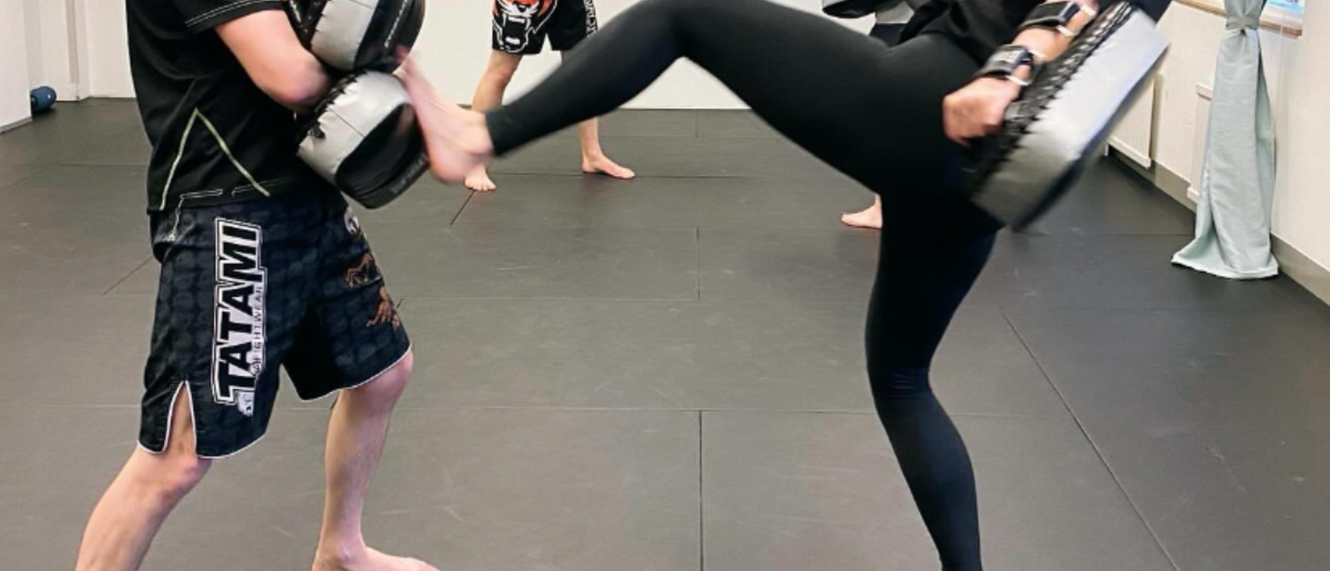 Thaiboxning är fartfylld och intensiv träning där vi provar på sparkar och slag på mitsar (skydd).