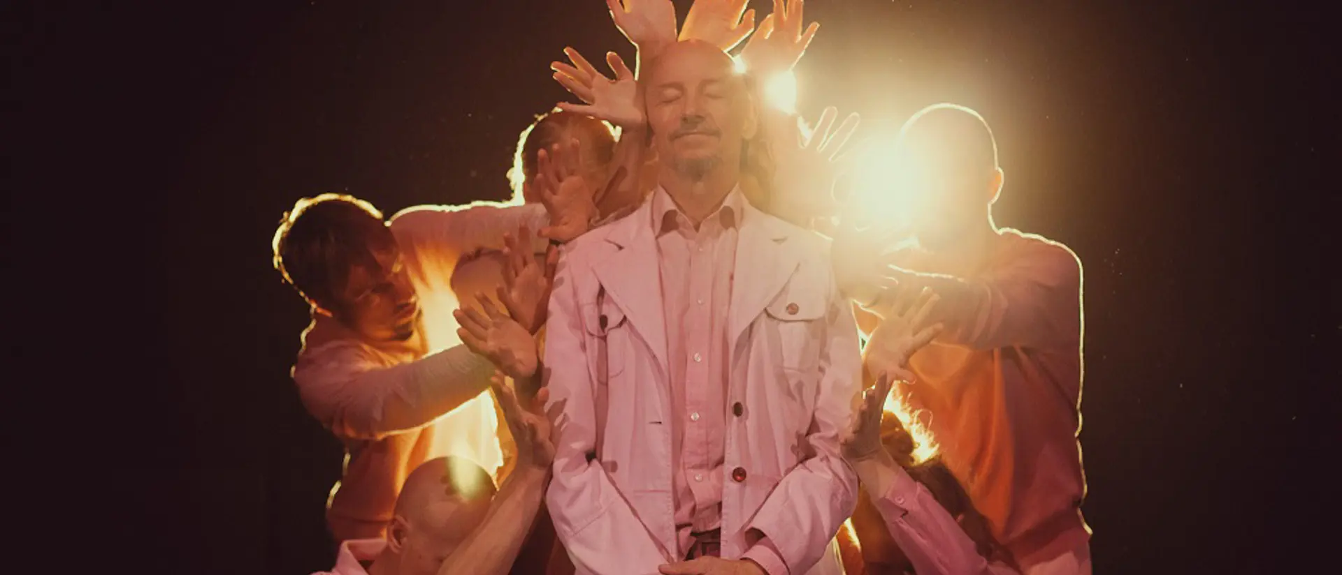 Sju dansare välkomnar dig och tar vänligt men bestämt kommandot. De leder oss genom 50 minuter samvaro, i en minutiöst koreograferad blandning av rörelse, röst och oerhört välkomponerade toner.