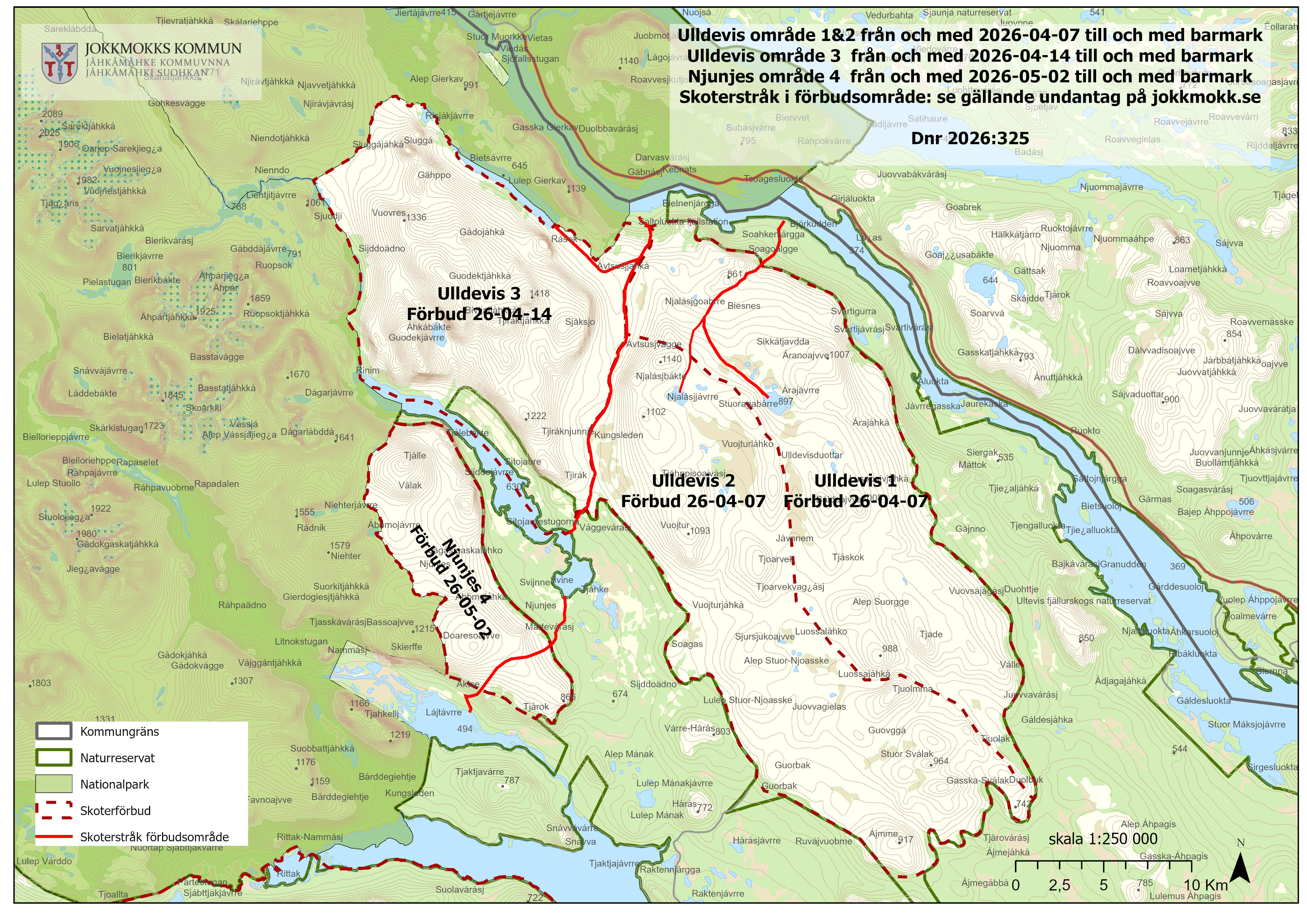 Tillfälligt skoterförbud beviljas under perioden med anledning av att renarna behöver betesro inför och under kalvning. Den som skrämmer eller på annat sätt ofredar renar som uppehåller sig inom förbudsområdet kan dömas till böter. Samråd i ärendet har skett med Länsstyrelsen Norrbotten enligt 15 § Terrängkörningsförordningen.