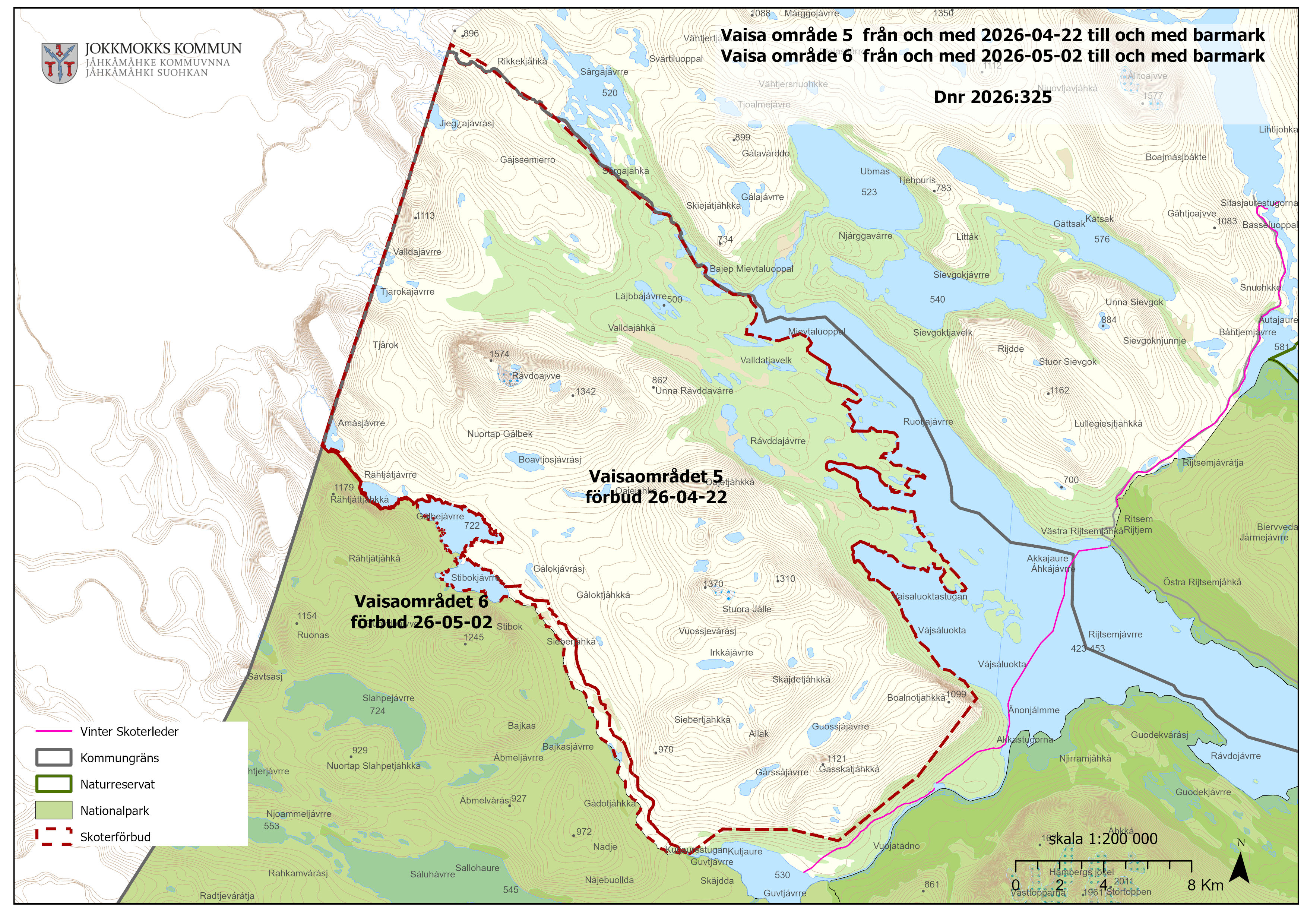 Sjöar undantagna från förbud, Árajávrre och Njalásjavrre till och med 2026-05-02. Den del av sjön Pietsaure/Bietsávrre som ligger utanför nationalparken är öppen.