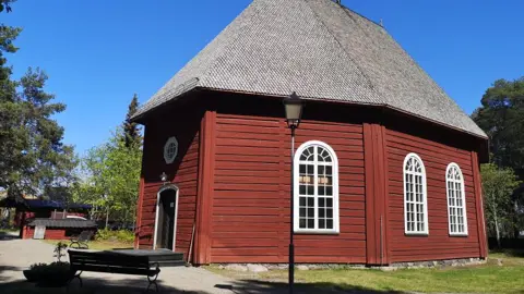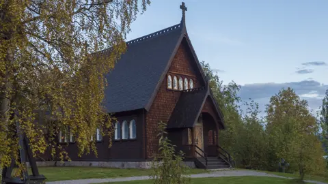 Träkyrka med spånklädda fasader